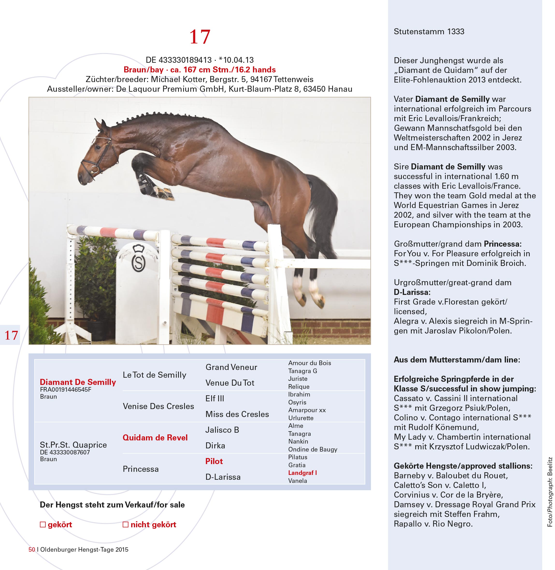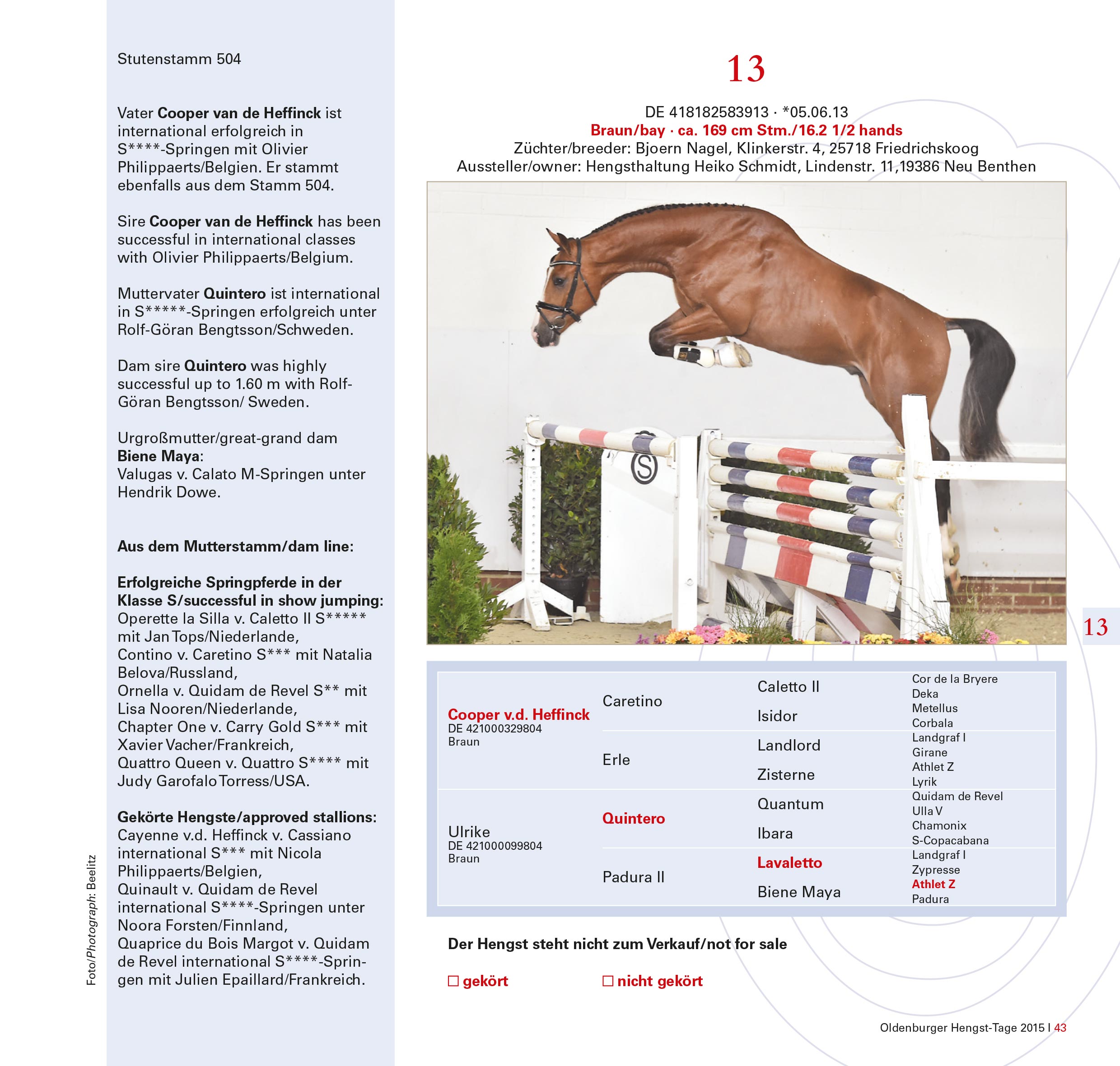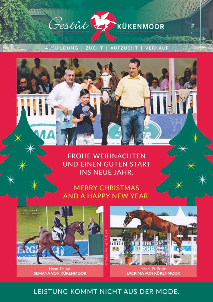 Bei der Hannoveraner Körung in Verden am 22.-24. Oktober 2015, wurde ein Hengst aus unserem Holst. Stutenstamm 4511, der Stamm unserer St. Pr. Stute "Umila Cara" und Ihrer Töchter St. Pr. Stute "Borgia von Kükenmoor" und "Lacrima von Kükenmoor", gekört und Prämienhengst.