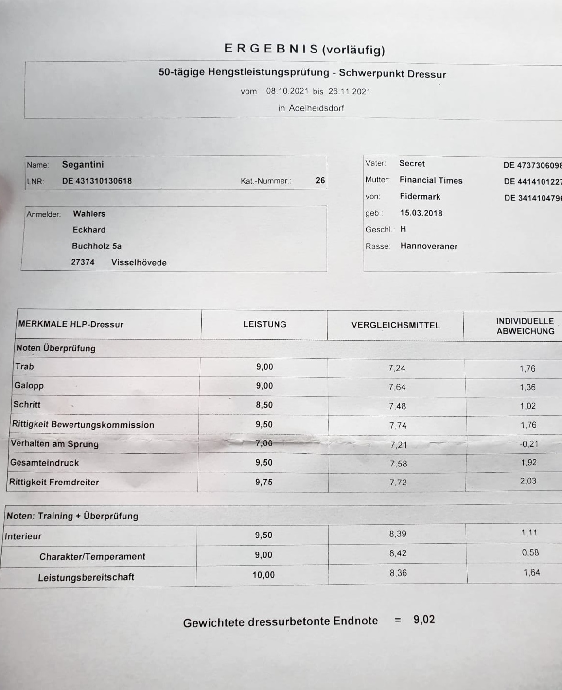Der "Secret" Sohn, Prämienhengst "Segantini" aus unsere ehemalige Zuchtstute "Financial Times" v. Fidermark, hat der 50 Tage Test in Adelheidsdorf gewonnen mit überragenden Noten und eine Traum Endnote von 9,02.